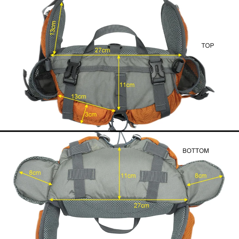 Size】: The main bag size is 27*16*11(W*H*D).It is fit for waistline from 108-148cm. The water bottle holder can accommodate a diameter of 600ml.