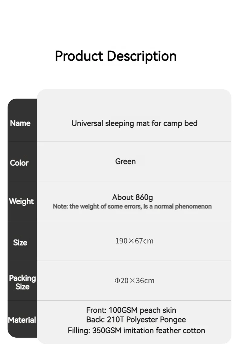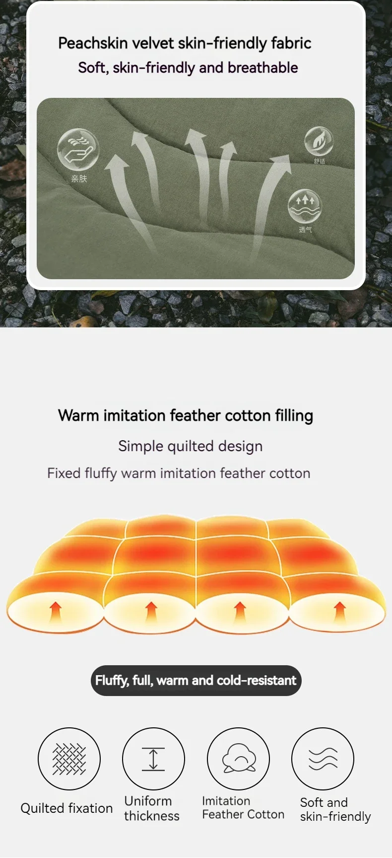 Material: 100GSM peach skin, 210T polyester pongee, 350GSM imitation feather cotton